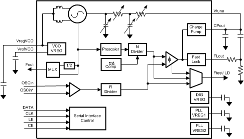 The LMX2531 is a low-power, high-performance frequency synthesizer system which includes a fully integrated delta-sigma PLL and VCO with fully integrated tank circuit. The third and fourth poles are also integrated and adjustable. Ultra-low noise and high-precision LDOs are integrated for the PLL and VCO, which yield higher supply-noise immunity and more consistent performance. When combined with a high-quality reference oscillator, the LMX2531 device generates very stable, low-noise local-oscillator signals for up and down conversion in wireless communication devices. The LMX2531 device is a monolithic integrated circuit, fabricated in an advanced BiCMOS process. Several different versions of this product accommodate different frequency bands.