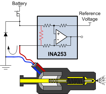 图 1-2 具有高侧电流检测功能的高侧驱动图 1-2 所示的电流检测放大器必须能够抑制高共模 dv/dt 信号,并支持低于接地电压的共模电压。在上述配置中,当高侧开关闭合时,螺线管由电池流出的电流进行供电。高侧开关的占空比决定了流经螺线管的电流,螺线管反过来控制栓塞的行程范围。当高侧开关断开后,电流流经反激二极管,强制共模电压将一个二极管的电压降至接地电压以下。