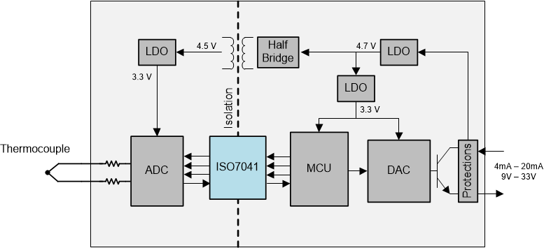 图 1-3 现场发送器 - 用于多通道和双向数据隔离的 ISO7041在现场发送器中使用数字隔离器的好处: