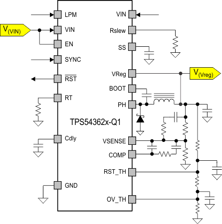 The TPS54362-Q1 device is a step-down switch-mode power supply with a low-power mode and a programmable voltage supervisor. Integrated input voltage-line feed-forward topology improves line transient regulation of the voltage-mode buck regulator. The regulator has a cycle-by-cycle current limit. Pulse-skip mode operation under no load reduces the supply current to 65 μA. Using the enable pin reduces the supply shutdown current to 1 μA.
