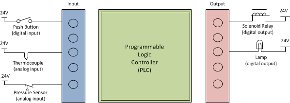 PLC システムの入出力は、図 1-1 に示すように、デジタルまたはアナログに分類されます。デジタル入力は、制御回路に ON/OFF の状態を示します。デジタル入力デバイスの例には、制限スイッチ、光電センサ、近接および圧力センサなどが挙げられます。アナログ入力デバイスは熱電対、速度計、力センサなどで、可変の応答を出力します。