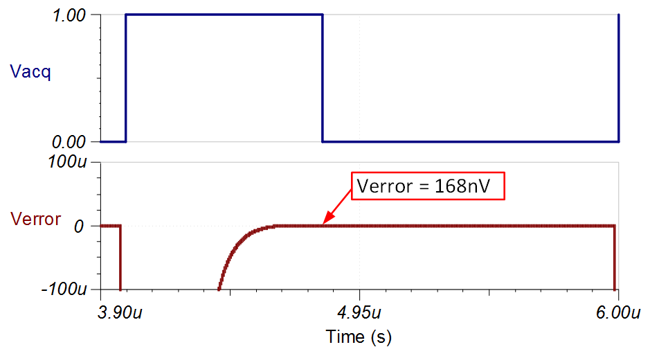 以下のシミュレーションは、+12Vおよび-12Vに設定したOPA197バッファ入力による24V DC差動入力信号へのセトリングを示しています。このようなシミュレーションは、サンプル/ホールド キックバック回路が適正に選定されていることを示します。この件の詳しい理論については、『Rfilt 値と Cfilt 値をリファイン』を参照してください。