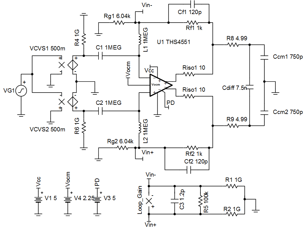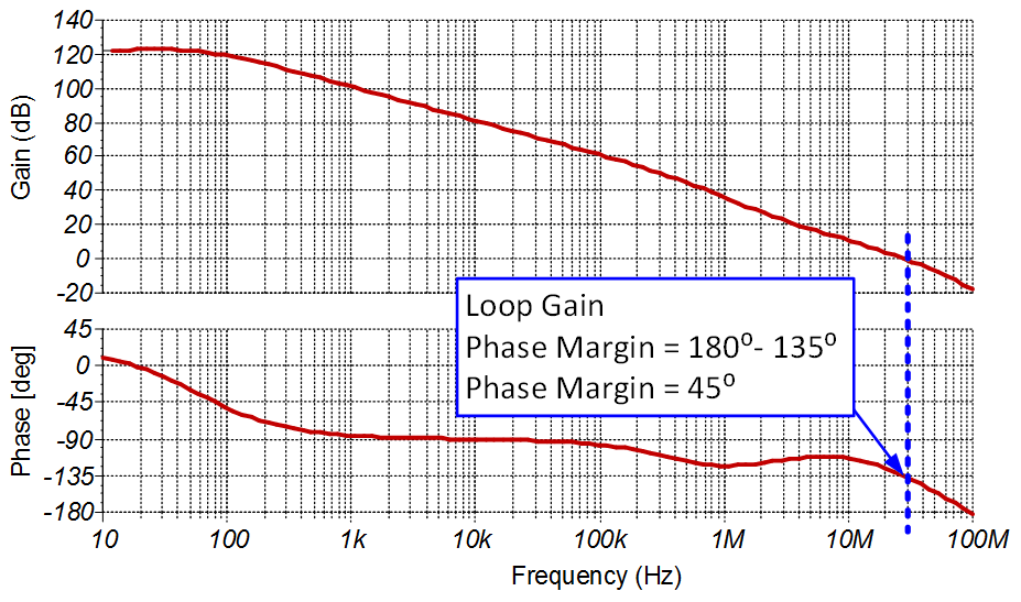 以下の回路をTINAで使用し、TINAのAC伝達解析を用いてループ ゲインを測定し、位相マージンを特定します。帰還ループ内に抵抗 RISO = 10Ω を使用して、位相マージンを増やします。この回路には45°の位相マージンがあります。この件の詳しい理論については、『TI Precision Labs - Op Amps: Stability 4』(英語) を参照してください。