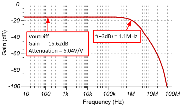 帯域幅のシミュレーション結果は約1.1MHzで、ゲインは-15.62dBであることから、線形ゲインは約0.166V/V (減衰率6.04V/V)となります。