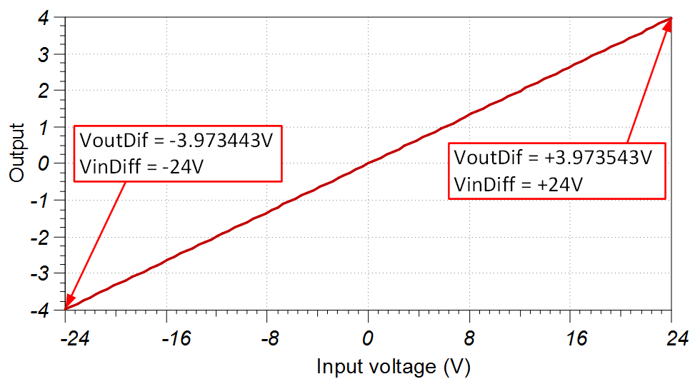 以下のグラフは、+24V~-24Vの差動入力に対する線形出力応答を示しています。