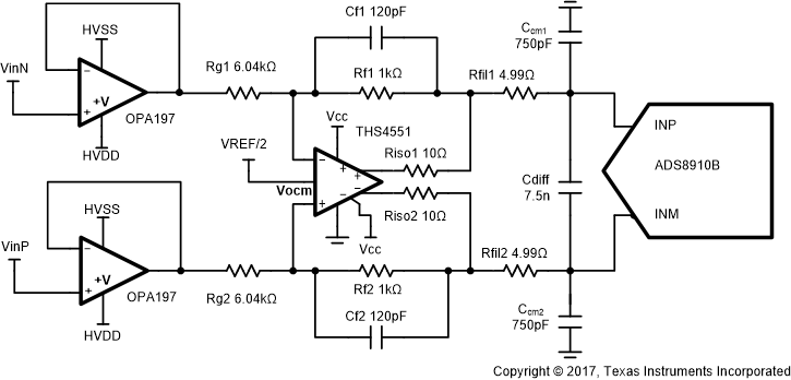 このアナログ フロントエンド(AFE)+SAR ADCデータ収集ソリューションは、±24Vの電圧範囲(または絶対入力電圧範囲VinP=±12V、VinN=±12V)で真の差動電圧信号を測定でき、高入力インピーダンスを実現し、最高500kspsのデータ レートと18ビットの分解能に対応します。入力バイアス電流が小さい高精度の36Vレール ツー レール アンプにより、完全差動アンプ(FDA)の入力をバッファできます。FDAは信号を減衰してSAR ADCの差動電圧/同相電圧範囲にシフトします。「部品選定」の値を調整して、さまざまな入力電圧レベルを実現できます。