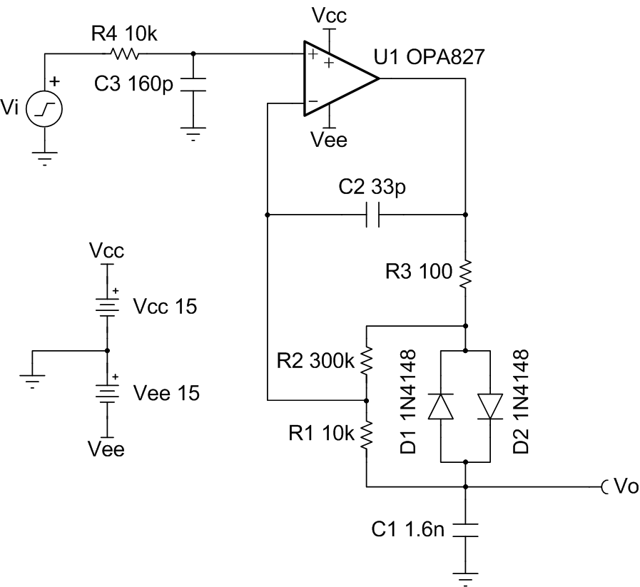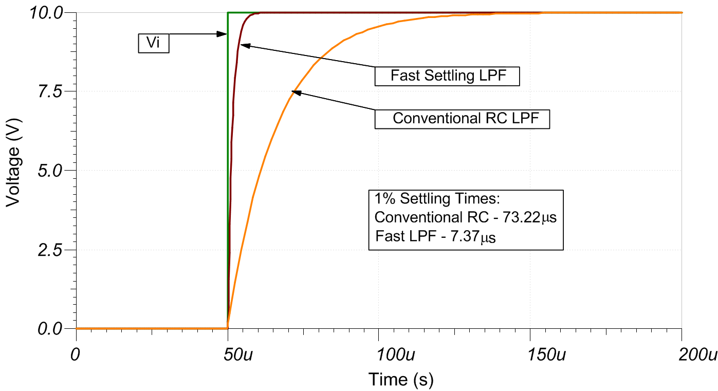 このローパス フィルタ トポロジは、従来型の単極 RC フィルタと比べてセトリング時間が大幅に短縮されています。このセトリング時間の短縮は、入力と出力の電圧の差が十分大きい場合、ダイオード D1 および D2 を使ってフィルタ コンデンサを急速に充電および放電することで実現しています。