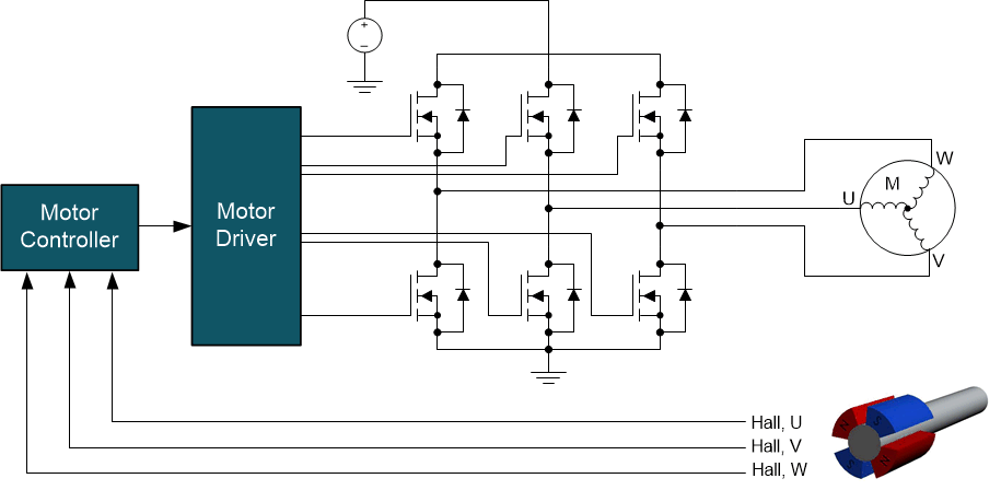 BLDC モーター制御用システムの実装を、図 1-5 に示します。3 つのハーフブリッジ回路を使用してモーターの位相を VCC または GND に接続することで、コイルに電流を注入し、さまざまな位相に必要な磁界を生成します。このシステムでは、モーター・コントローラを使用して整流を決定します。コントローラには、マイクロコントローラ、FPGA、DSP、デジタル・ステート・マシン、または純粋なアナログ実装を使用できます。このモーター・ドライバを使用すると、制御ブロックをハーフブリッジ回路と接続でき、モーター・ドライバからハーフブリッジ回路を経由して整流を決定できます。ホール位置センサは、回転子の位置に関する情報をモーター・コントローラに送り、モーター・コントローラはその情報を使用して、ハーフブリッジ回路をどのように駆動するかを決定します。図 1-5 に示すシステム・アーキテクチャの代わりに、一部のモーター・ドライバにはハーフブリッジ回路が内蔵されているため、図に示す外部ハーフブリッジ回路は不要です。