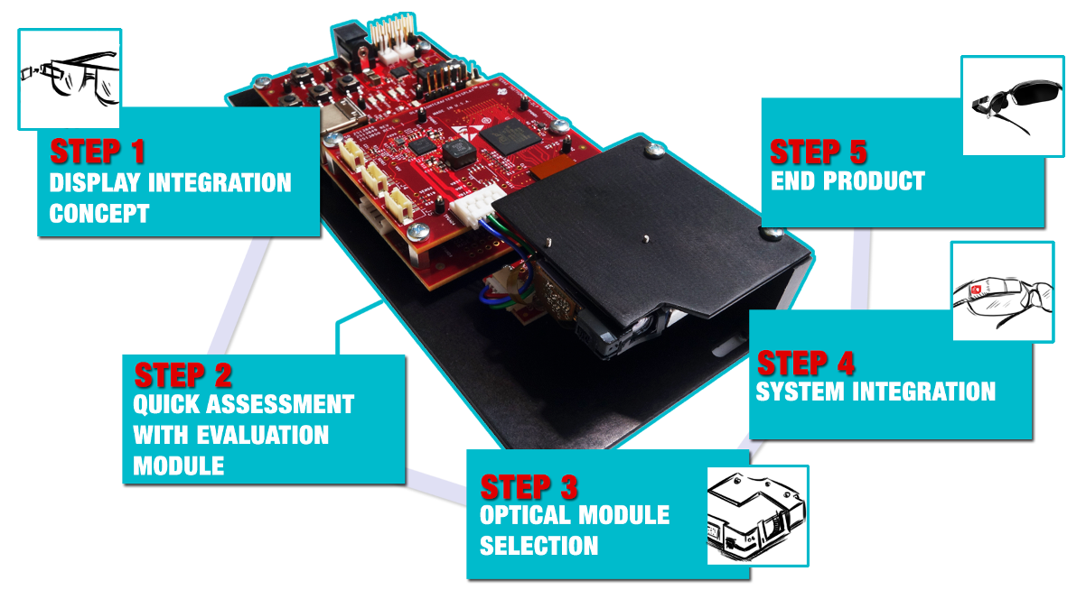개발자들은 DLP 디스플레이 기술을 위한 설계 및 제조 에코시스템의 성숙도를 이용해 디스플레이 애플리케이션 개념을 아래에 묘사된 것처럼 신속하게 생산 단계로 전환할 수 있습니다.