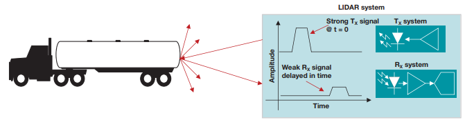 Figure 1-1 LIDAR Transmission and Receiver FunctionalityLow side drivers tend to be common for LIDAR applications. Two recommended gate drivers for LIDAR are the LMG1020 and LMG1025-Q1 GaN gate drivers. These two gate drivers are ideal for GaN applications since they are capable of high frequency applications, ns pulse widths, and have a short propagation delay. They are able to drive a FET to produce a <1.5-ns laser optical pulse in excess of 100 W, making them great for LIDAR applications. Figure 1-2 shows a block diagram of a general LIDAR application from the TIDA-01573 reference design. Some of the key components include a pulse shortening buffer for to create ns pulse widths, the GaN gate driver, the GaN FET, and the laser diode. The driver will pulse the FET on and off so that the laser diode can send multiple pulses to map objects and their distances.