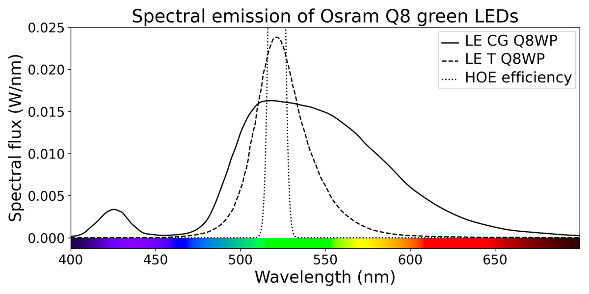 total flux, and HOE efficiency curveLED illumination has a number of advantages over laser illumination including a wider operating temperature range, higher reliability, no active cooling required, lower cost, and a greater number of commercial options.