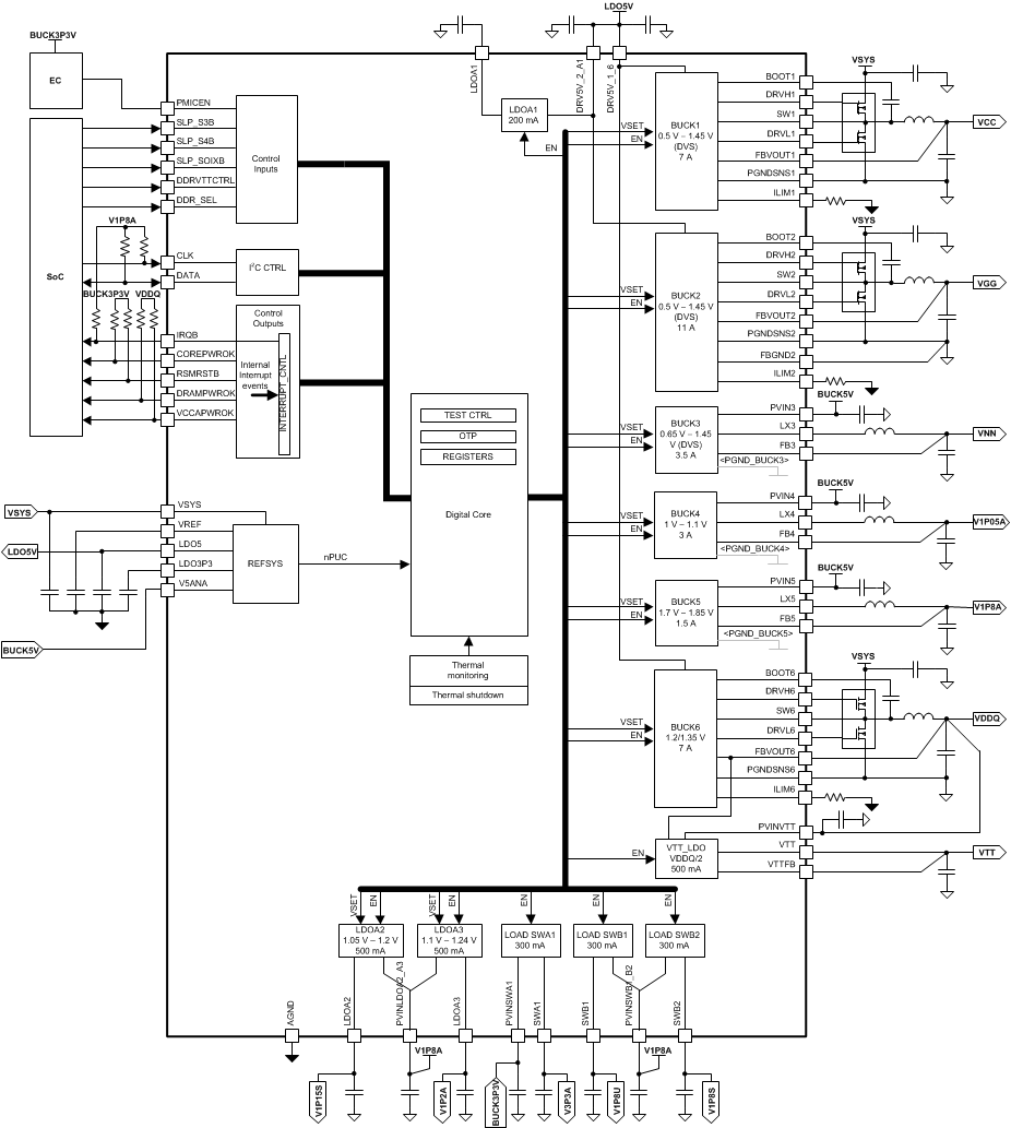 The TPS650842 device is a single-chip solution, power-management IC designed specifically for the latest Intel™ processors targeted for tablets, ultrabooks, and notebooks with NVDC or non-NVDC power architectures, using 2S, 3S, or 4S Li-Ion battery packs. The TPS650842 device is used for essential systems with low-voltage rails merged for the smallest footprint and lowest-cost system-power solution. The TPS650842 device provides the complete power solution based on the Intel Reference Designs. Six highly efficient step-down voltage regulators (VRs), a sink or source LDO (VTT), two LDOs, and three load switches are controlled by power-up sequence logic to provide the proper power rails, sequencing, and protection—including DDR3 and DDR4 memory power. The three regulators (BUCK1–BUCK3) support dynamic voltage scaling (DVS) for maximum efficiency—including support for Connected Standby. The high-frequency VRs use small inductors and capacitors to achieve a small solution size. An I2C interface allows simple control by an embedded controller (EC) or by a system on chip (SoC). The PMIC comes in an 8-mm × 8-mm single-row QFN package with a thermal pad for good thermal dissipation and ease of board routing.