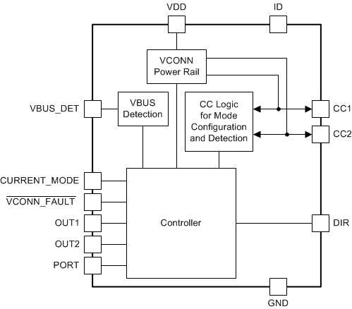 The TUSB321AI device when configured as a DRP alternates configuration as a DFP or UFP according to the Type-C Specifications. The CC logic block monitors the CC1 and CC2 pins for pullup or pulldown resistances to determine when a USB port has been attached, the orientation of the cable, and the role detected. The CC logic detects the Type-C current mode as default, medium, or high depending on the role detected. VBUS detection is implemented to determine a successful attach in UFP and DRP modes.
